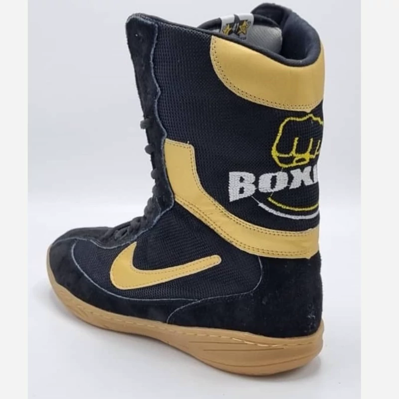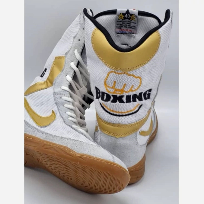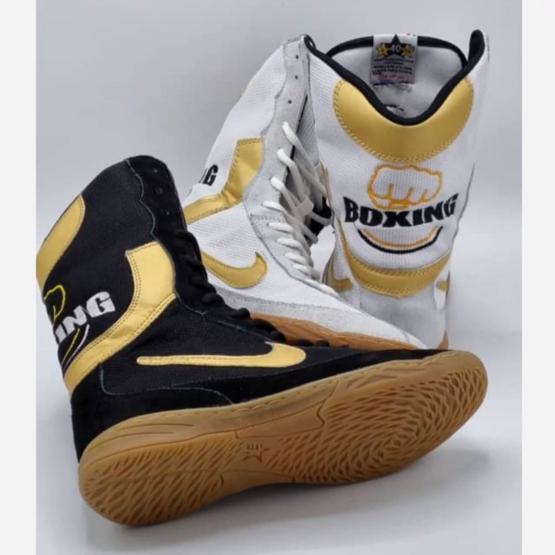 کفش بوکس یکی از الزاماتی در پیشگیری از آسیب ها و اجرای بهتر حرکات پای بوکس هستش که موجب میشه بوکسور در رینگ راحت تر باشه و فنون خودش رو بهتر اجرا کنه.به دلیل چرخش مچ پا و جابجایی های مکرر کفش بوکس باید ساق بلند یا در مواردی ساق کوتاه که ساقش باید مقداری بلندتره از کفش کشتی باشه هستش تا مچ پا هنگام چرخش و جابجایی پیچ نخوره.